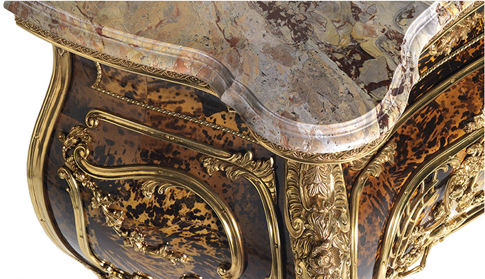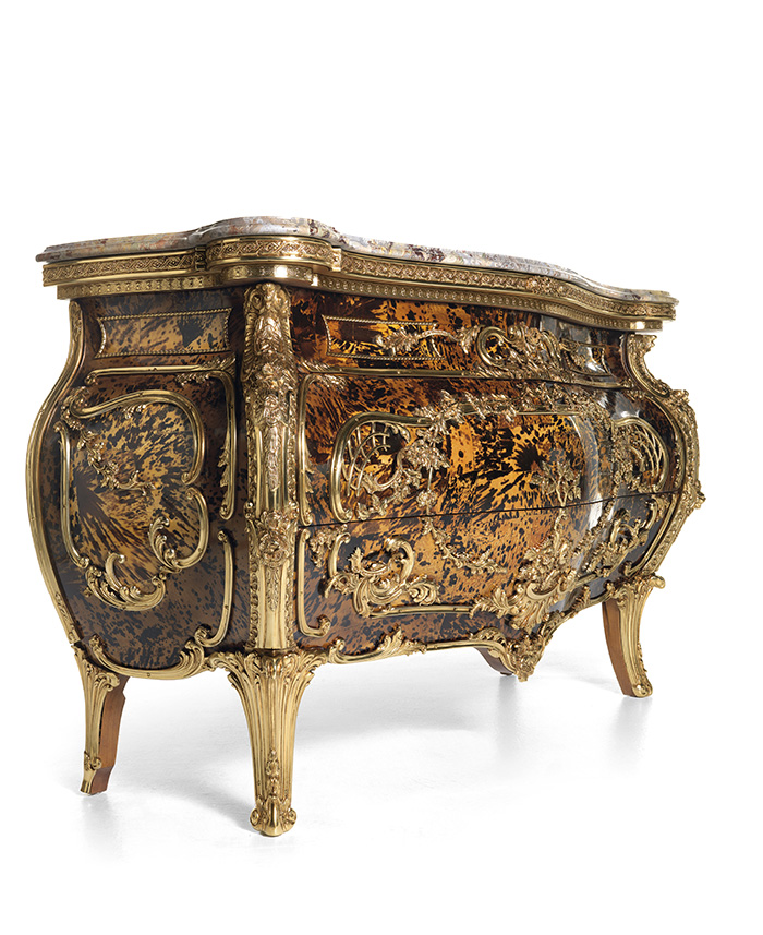 拿破仑斗柜(Napoleon Chest of Drawers),原版为腓特烈大帝的御用斗柜,现珍藏于德国波茨坦无忧宫。该复刻版使用 Sarrancolin 大理石作为表面,并创造性地以稀有龟甲作为柜面装饰,配以精雕细琢的脱蜡青铜纹饰彰显质感。Jumbo Collection 在中国