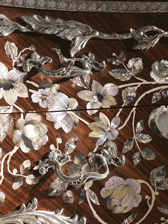 17-18世纪被认为是欧洲王室的黄金时代,政局平稳且生活富庶,艺术领域更是空前繁荣。古典主义、巴洛克主义、洛可可主义等艺术风格各领风骚,至今为人津津乐道。在此影响下,从“太阳王”路易十四到腓特烈大帝,贵族们均崇尚“豪奢华丽”的生活艺术。Jumbo Collection 便以18世纪极富手工艺价值,至今珍藏于欧洲各皇宫、博物馆的御用家具为蓝本,加以珍珠母贝、龟甲等珍稀材质,打造出了复刻这些古典家具的 Master Pieces 大师系列。
