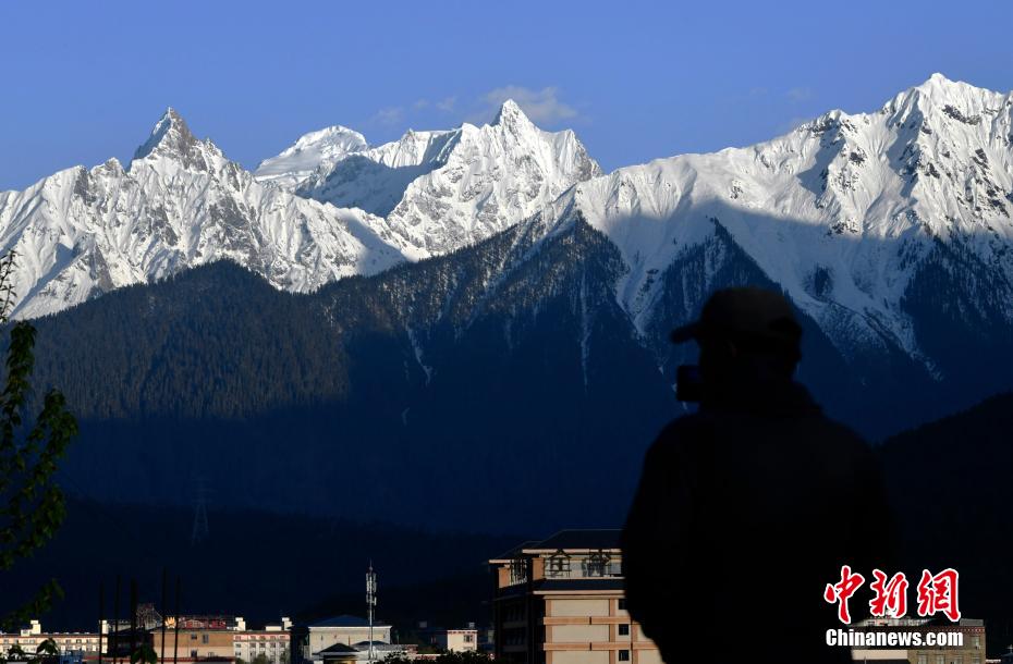图为5月13日,游客正在拍摄西藏波密县雪山风光。