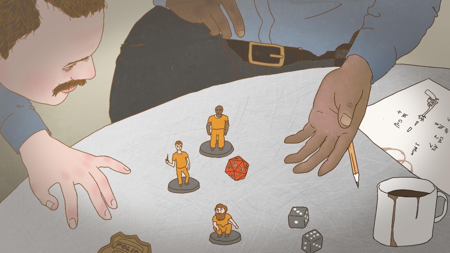 游戏由一名地下城主(Dungeon Master,DM)主持,负责构建世界,创造冒险故事,也是整个冒险的仲裁者和说书人,通常情况下DM根据DND预设的剧本搭建剧情,其他人——包括斯特林里的犯人们,喜欢自己动手搞一些创意玩法,比如骰子,20面骰子是游戏中的重要道具之一,用来抛掷点数进行判定。但它在监狱中被禁止持有,所以囚犯们想出的办法是用20张卡牌代替,用来“掷点”。