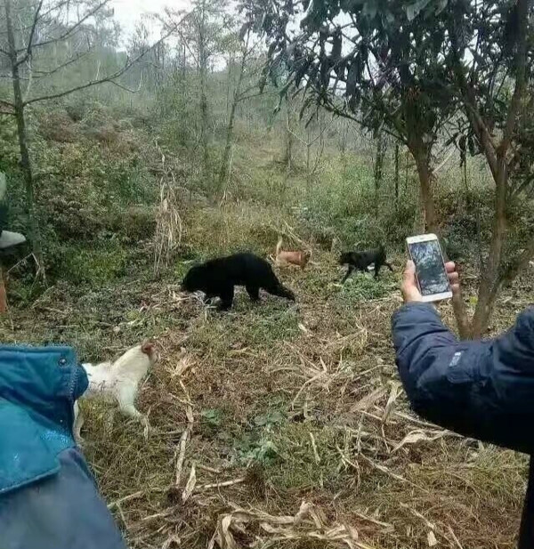 有网友在转发时描述称:“小熊下山迷路,被大凉山村民生擒活剥”。与此同时,另一段黑熊生前在田间林地里与两只小狗追逐的视频也在网上传开。