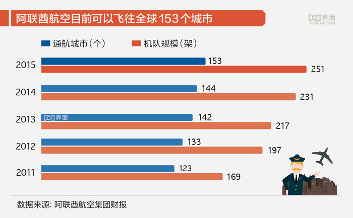 2011年至今,阿联酋航空运营的A380的数量从21架次增至目前的85架次,波音777的数量也从102架上涨到156架,航点从123个到现在的将近160个,可用座位公里(可销售的座位数乘以航段距离)增长66%。大飞机成了阿联酋航空抢占市场最重要的武器。