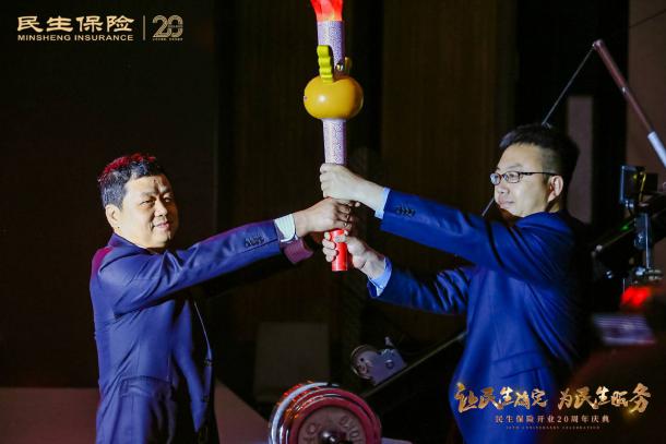 现场火炬手分别是深圳分公司总经理张秀、长期服务代表夏庆收、优秀代理人宁波分公司冯静华、山西分公司总经理付谊龙和辽宁分公司总经理华正果,他们在现场举起代表着希望和梦想的火炬依次传递,并传给第一棒火炬手同时也是最后一棒火炬手——民生保险总经理吴志军,火炬传递以终为始,他用手中的火炬将火盆点燃,熊熊燃烧的火光照亮所有民生人,为公司开业二十周年送上最诚挚的祝福。