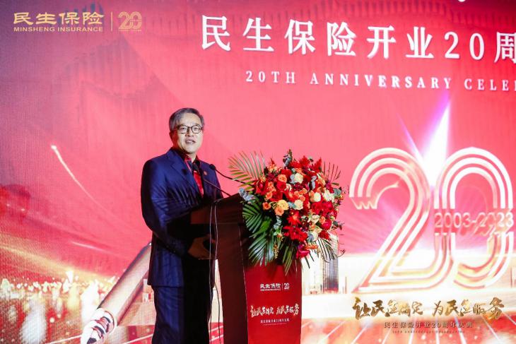 庆典上,民生保险董事长鲁伟鼎发表致辞,感谢20年来所有民生保险人的付出和努力,并指出未来的目标是建设公司,要清楚时代的契机等待我们去把握,要以用户为中心,要为用户去服务,让用户对公司更加信赖。