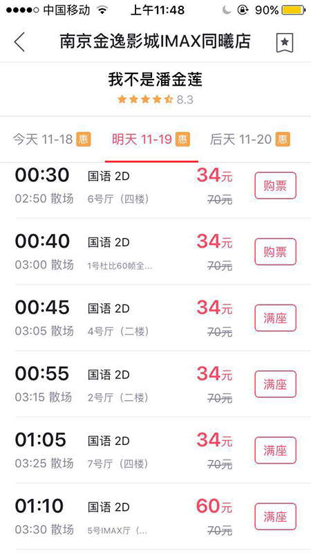 以南京金逸影城IMAX同曦店为例,上周五上午通过淘票票查询11月19日排片时,《我不是潘金莲》的满场情况从零点到三点分布,而且5号IMAX厅也列入其中,不过按照惯例,IMAX影厅通常不会排非IMAX影片的日常场次。随后至周五午间,上述场次均已在各家电商平台下架。