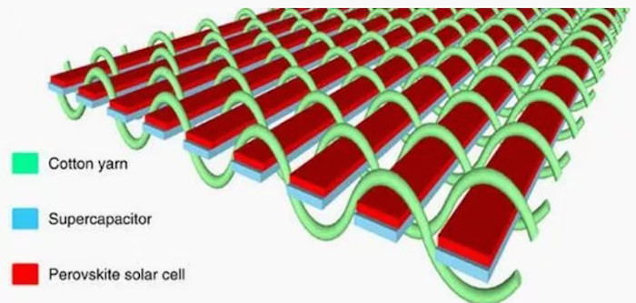 在这篇发表在Nature Communications的研究中,Thomas和他的同事通过纳米技术制造出了一个被称为“铜带”的带状材料,这种“铜带”薄而柔软,可以嵌入到衣物中,并且能够同时吸收和储存太阳能。每一块“铜带”由共享电极的一个太阳能电池板和一块能储存能量的超级电容器组成,用纱线可以将这些“铜带”编织在一起,从而实现可穿戴。