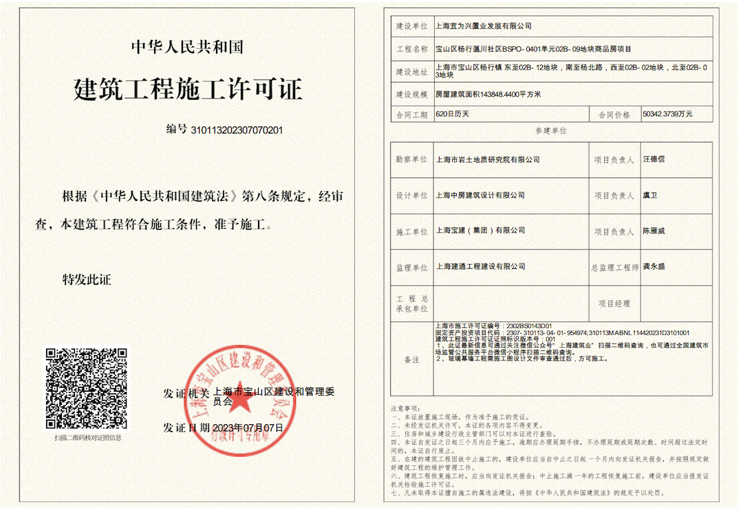 近日,在淞滨路1号宝山区政务服务中心,上海宜为兴置业发展有限公司同时取得了《建设工程设计方案》《建设工程规划许可证》《建设用地规划许可证》《建设工程施工许可证》,这是宝山区今年首个“四证齐发”的项目。