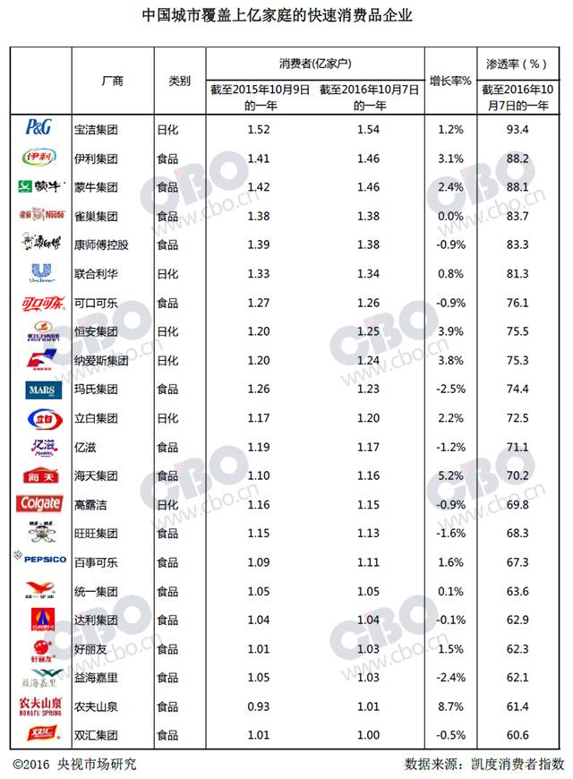 据凯度消费者指数最新研究表明,截至2016年10月7日的52周,有22家快速消费品企业拥有过亿城市购买家庭;其中,日化企业达6家。
