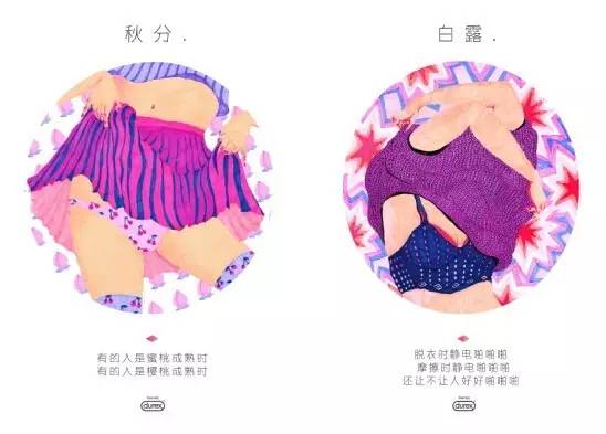情欲是最原始的内驱力,但是对外传播时,“要风流不要下流,要情色,不要色情”。否则不仅网管会找你,内容的调性也很糟糕。从文化心理的角度,讲得太直白也很难上台面。因此就情欲而言,多用暗示少直白。维多利亚的秘密,每年会做非常盛大、绚丽的新品发布会。它的包装、灯光,全世界最一流的超模在台上所展示的,都是情色的暗示。而你不会联想到色情,所有的人都会去爱上它。还有杜蕾斯,作为一个借势营销的高手,每一次重大事件出来以后,所有人都在期待,这一次杜蕾斯能够玩什么。这是他们24节气图,每一次都会画出一个小东西来,把它弄得很好玩。