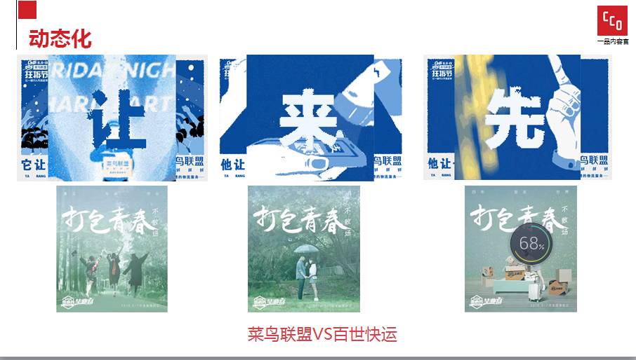 然后是动态化。为什么说动态很重要,大家看这两组图,下面是百世快运今年6月份毕业季做的海报,上面是菜鸟联盟双11做得一次推广。百世快运打包青春系列的海报,有情怀,有情感,有情绪,在毕业那个时间点推出来,非常地吸引人。但是当它跟菜鸟联盟的海报放在一起的时候,就很容易被忽略。在消费者注意力资源越来越稀缺的情况下,要通过动态的一些表现手法,去抢注意力。