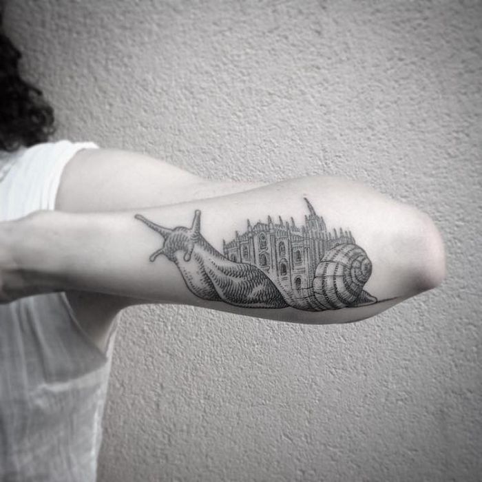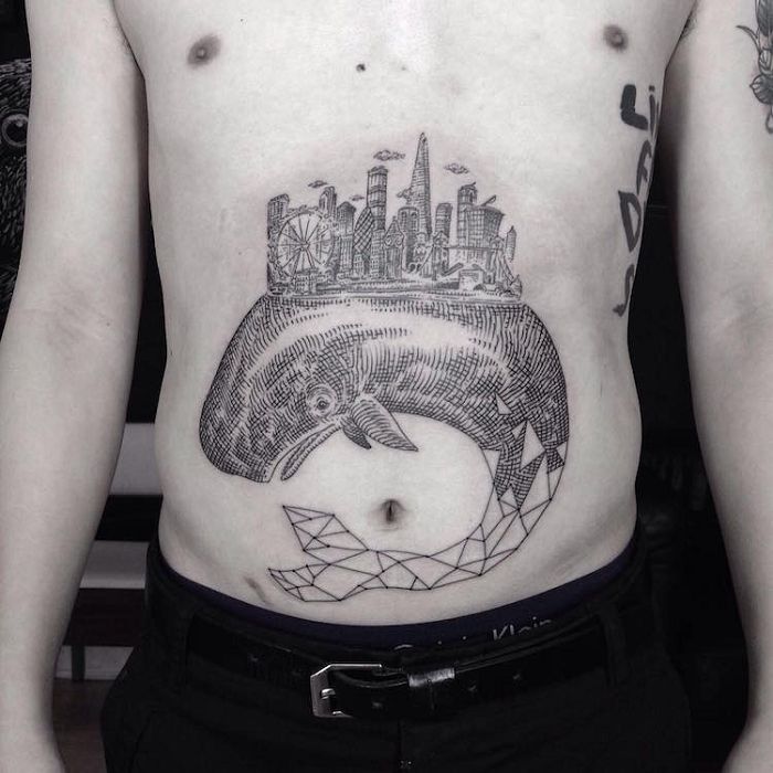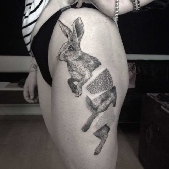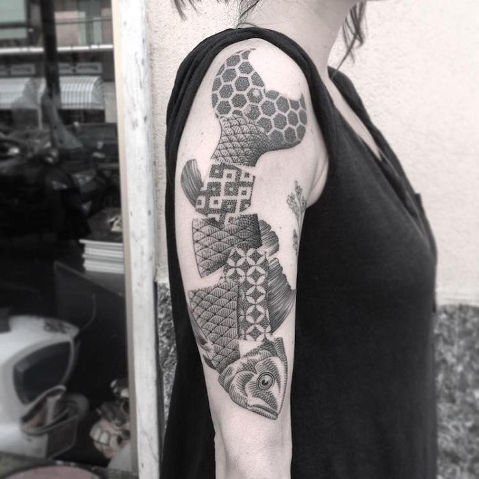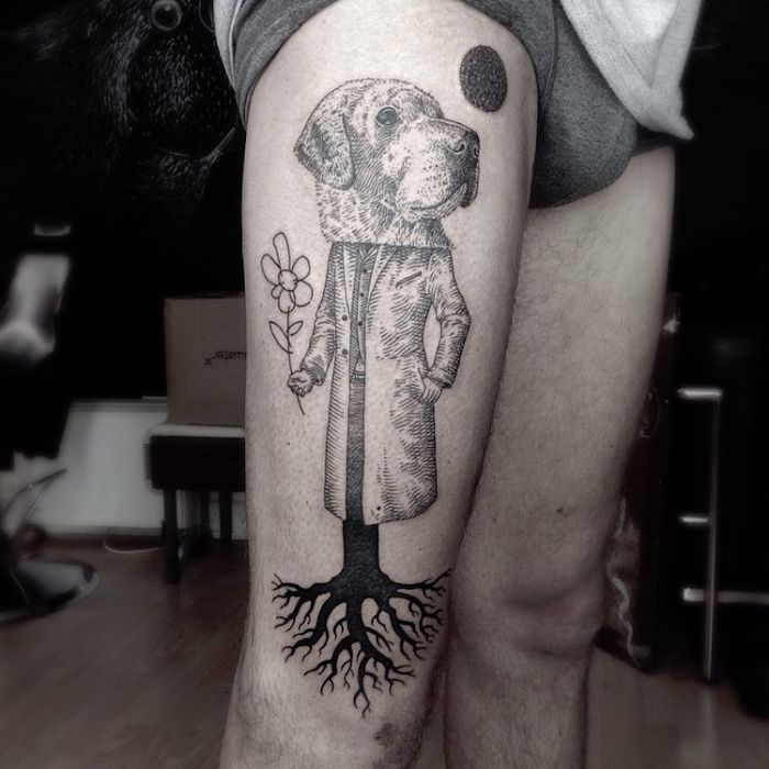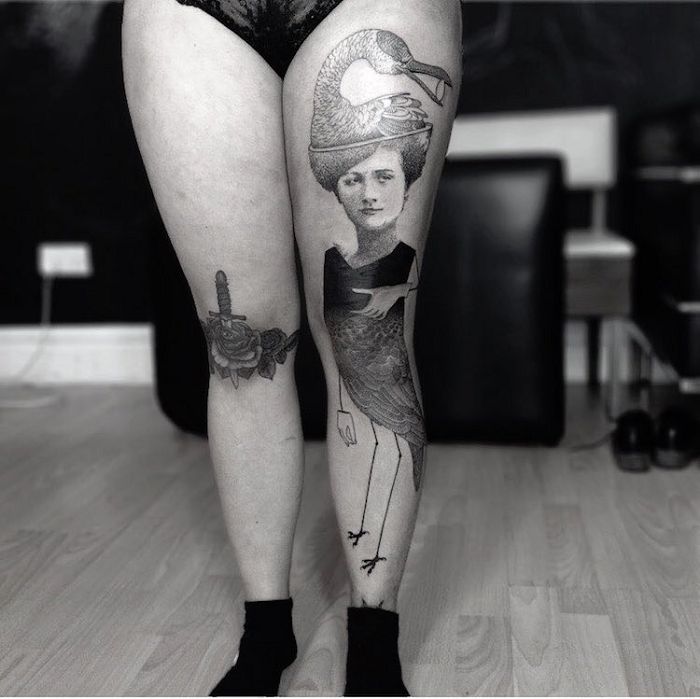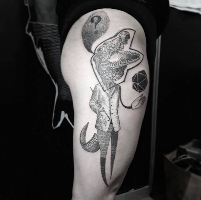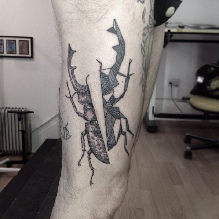 简单地看一眼达姆布拉的文身作品我们会发现,他的文身作品与版画艺术结合得非常紧密。实际上,有时候一张图片从印刷媒介过渡到人体其实非常简单,达姆布拉的作品在保留成熟艺术感的同时插入了现代的纹理图案和各种物品并且将其与当代世界牢牢结合在了一起。