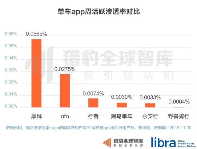 根据猎豹全球智库提供的数据,截至今年11月20日,共享单车领域目前只有6个app具有一定规模的活跃用户。