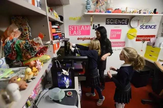 马利蒙特学校(Marymount School)是纽约市上东区的一所私立女校,走进该校,你立刻会被其中一间教室所吸引。在教室中,你会发现3D打印机,激光镭射打印机,小型机器人部件以及各类完成至一半的艺术品。这里的每个人,从小学生到高三即将毕业的学生,纷纷动手完成属于自己的作品。而这些作品,往往又是能够立刻应用到生活中的:比如,3D打印的生日礼物,小型机器人等。
