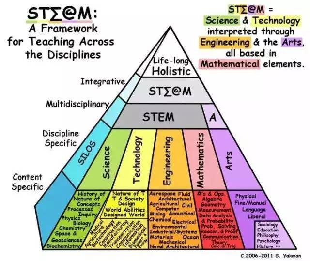 其实,STEAM教育就是在原有STEM教育基础上加入了“艺术”,包含较广泛的人文艺术科目,涵盖社会研究social studies 、语言language 、形体 physical 、音乐musical 、美学fine arts 和表演performing等。