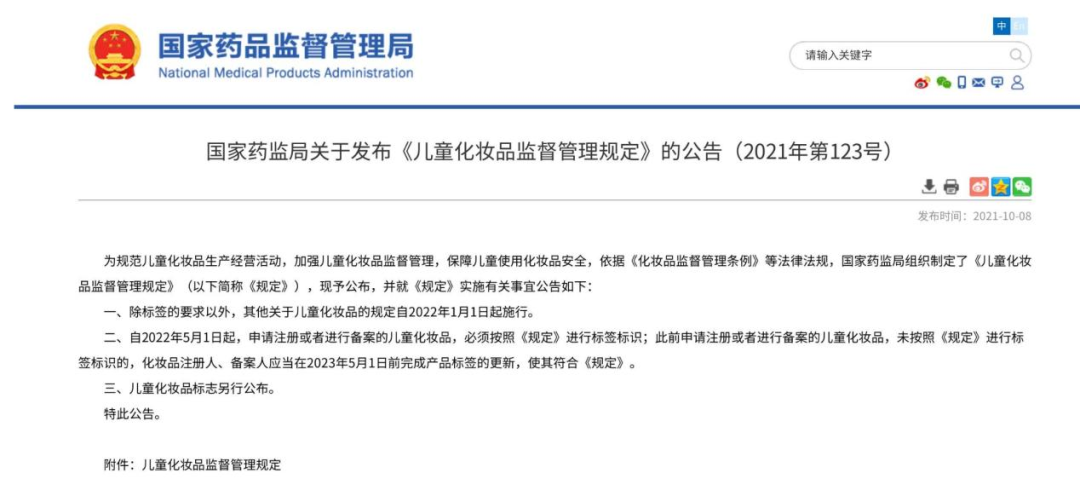 2021年9月,国家药监局发布了《儿童化妆品监督管理规定》,明确了儿童化妆品的定义,即“适用于年龄在12岁以下(含12岁)儿童,具有清洁、保湿、爽身、防晒等功效的化妆品。”。规定于2022年1月1日起执行。