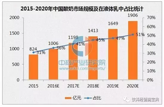 2015-2020年,由于基数的扩大,酸奶市场的增长率将略有下降,但仍保持18%左右。预计2020年将达到1900亿,届时在液态乳中占比将超过50%。