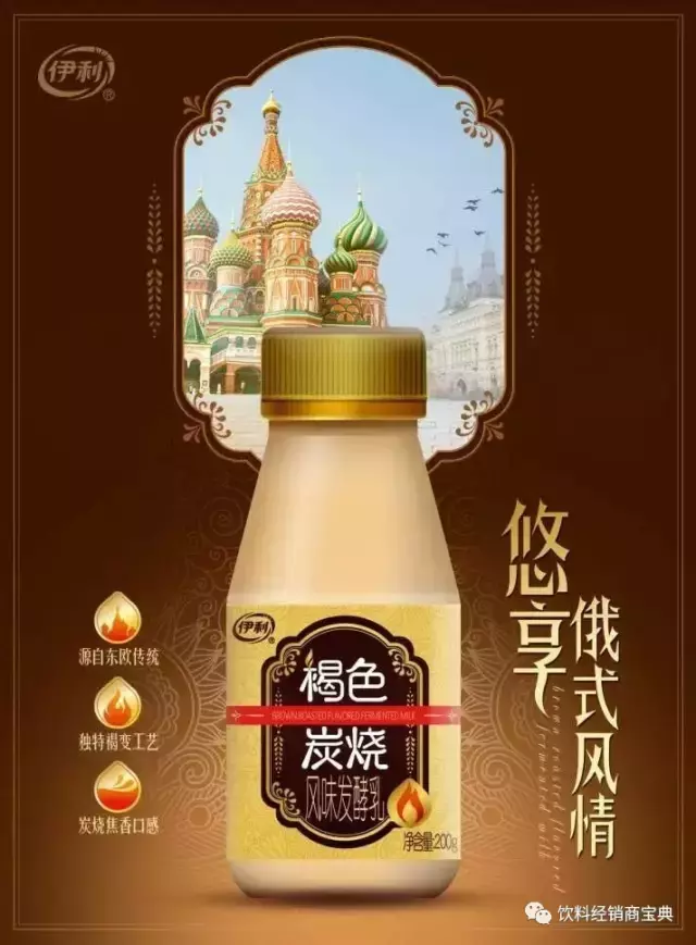 定位“一款富有俄罗斯异域风情的焦香酸奶”。源自东欧传统、独特的美拉德褐变工艺,7小时慢发酵,有炭烧般焦香口感。伊利此举意在打造“熟酸奶”的品类风向标,以迎合喜好尝鲜和热衷异域美味的细分年轻消费人群。
