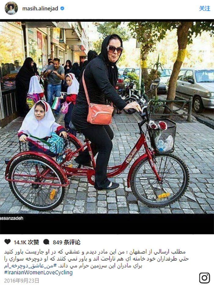在#伊朗女性爱骑车#标签之下(#IranianWomenLoveCycling),有人发了这样一条推特:“当我们听说教令禁止女性骑车之后,我们马上去租了两台自行车。”