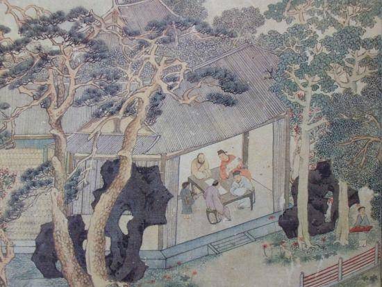 这是在第二十一回“吴月娘扫雪烹茶,应伯爵替花勾使”中,当时天降大雪,“冻合玉楼寒起粟,光摇银海眩生光”,正与西门庆及家中众妇人在花园中饮酒赏雪的吴月娘骤生雅兴,下席来,叫小玉拿着茶罐,亲自扫雪,烹江南风团雀舌牙茶,与众人吃,正是“白玉壶理翻碧浪,紫金杯内喷清香”。