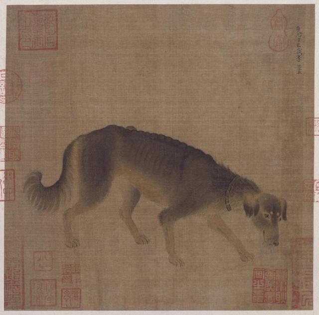 犬类作为专门的绘画题材最早出现在北宋《宣和画谱》中的“鸟兽”一门。宋代不乏画犬的专家,如宫廷画家李迪、李嵩、赵永年等。此图描绘的是宫廷御用猎犬,步伐矫健而闲雅。画风追求工整写实、细腻华丽而又形神兼备的宫廷审美趣味,是宋代院画的典型作品。