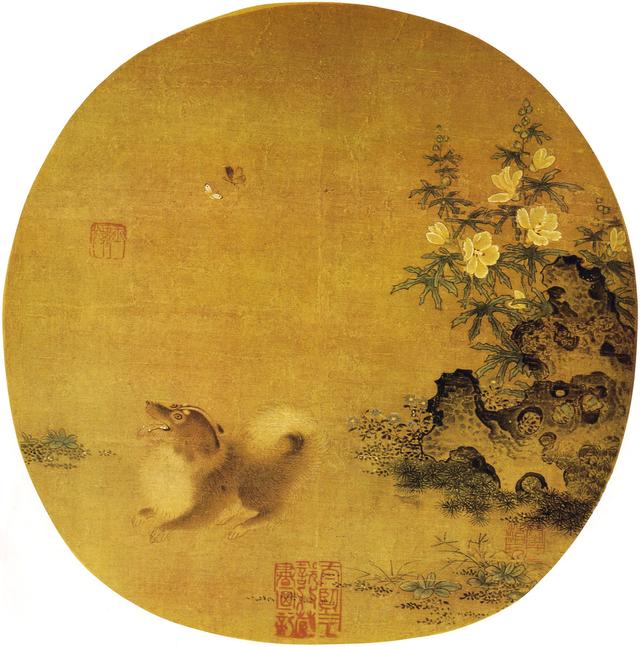 《秋葵犬蝶图》画的是一只小狗在山石花草中仰视蝴蝶,小狗抬头翘尾,姿态可人,空中蝴蝶翩翩飞舞,一派恬静安逸。《秋葵犬蝶图》是典型的宋代院体花鸟画,用笔细致,抓形准确,形态生动。小狗与蝴蝶自然真实可爱,右侧所画秋葵花,花朵洁白、枝叶茂密,花叶用色层层渲染,风格纯净无华。