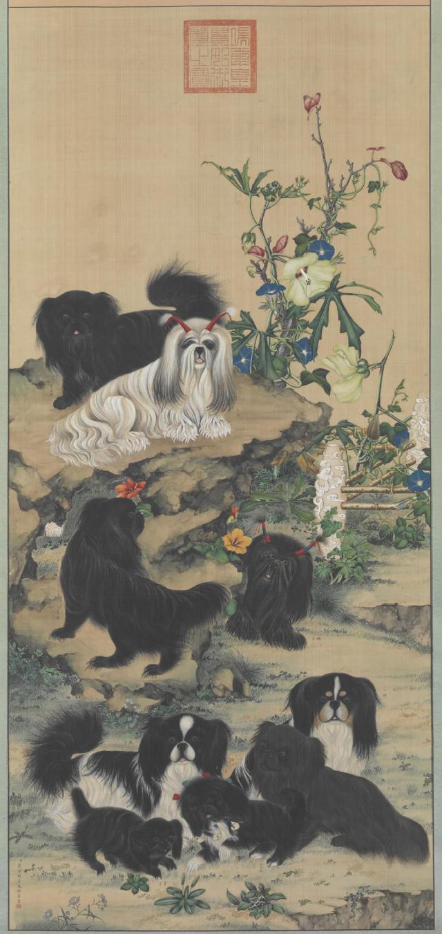 本幅款识:“臣黄际明、李廷梁恭画”,钤“敬画”印。画上方钤“端康皇贵妃御览之宝”。图中描绘宫苑花丛中9只名贵的哈犬,标注的名字分别为“墨子”、“墨球”、“栀子”、“小横”、“松子”、“墨匙”、“狮子”、“小点”和“墨牡丹”。小狗们毛色为黑、白或黑白杂色,有的头上梳着发辫。它们毛发浓密,眼神高傲。据画上方的印记推断,此图是专为端康皇贵妃所作,画的是她驯养的宠物犬。