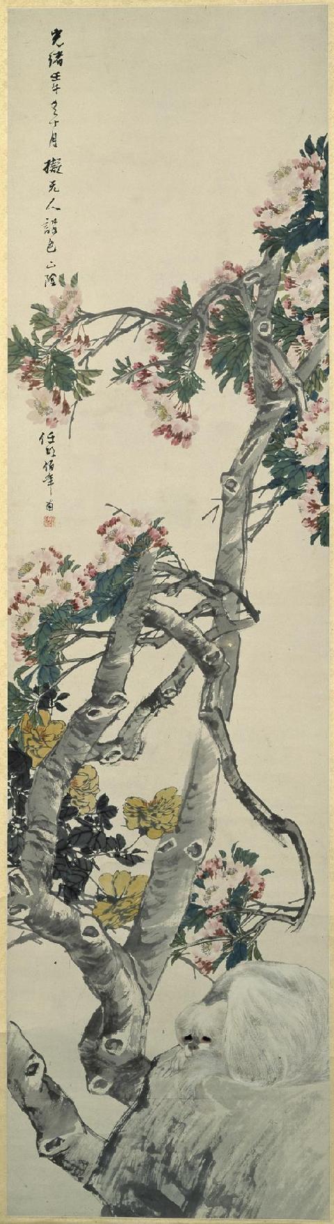 《花荫小犬图轴》清,任颐绘,纸本,设色。纵180cm,横47.5cm