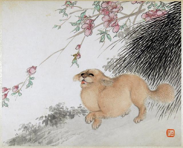 任预是海派画家任熊之子。在他这本图册中,生动地描绘了日常生活中狗的形象。图中桃花盛开,草色清润,天空明朗,一只黄色的小哈犬自由欢快地嬉戏玩耍。画面设色明艳,充满了新春喜庆的气息。