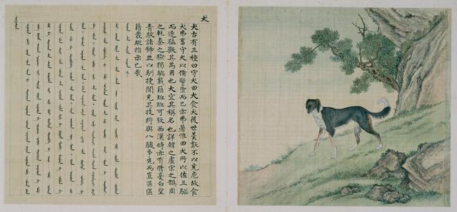 《兽谱图册——犬》清乾隆,余省、张为邦等绘,绢本,设色。纵40.1cm,横42.5cm