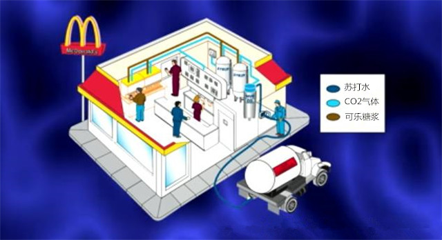 因此,麦当劳具备最先进的生产线设备来满足平时的服务。商家使用的二氧化碳是相同的,但用制冷机和碳酸化器将二氧化碳渗入苏打水中,饮料口感会更好。遥控制冷机组基本上是一个水浴浸在水中产生的巨大的制冷线,苏打水和糖浆通过这个不锈钢管混合数次,所以我们通常喝的麦当劳可乐是36度。