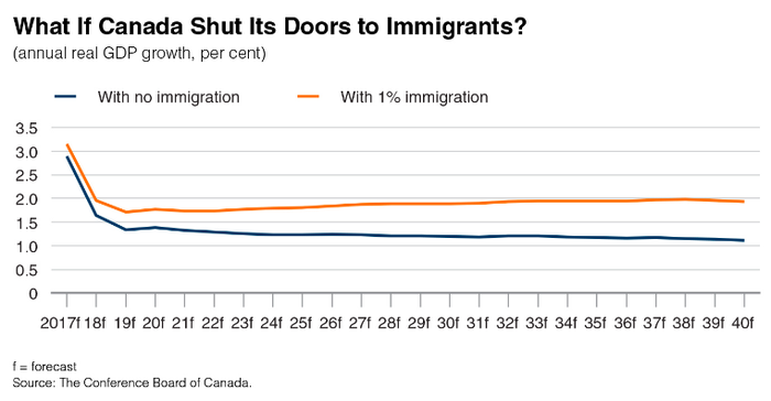 有趣的是,非盈利智库加拿大会议委员会(The Conference Board of Canada)曾发表过一个研究:如果加拿大停止接收移民,随着出生率下降、人口不断老龄化,加拿大的人口增长可能在20年内降到零点。同时,65岁及以上的人口将在2040年前达到26.9%,工人与退休人员比例将从3.6下降至2.0。劳动力的空前短缺将最终导致国内经济增长率从1.9%降至1.3%。