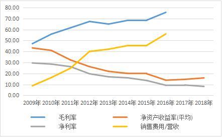 从盈利能力来看,虽然罗欣药业通过布局原料药业务,降低制剂成本,主营业务毛利率总体呈现增长趋势,2016年达到75%,但公司整体盈利能力却越来越低,其净利率一度从高达近30%持续下降至去年仅有的8.18%,且连续三年低于10%;净资产收益率(平均)亦从此前超40%下降至最近三年的15%左右。这很大程度上跟公司销售费用持续增长、加大研发投入等不无关系,如2016年其销售费用率曾高达56%,而近两年两票制实施等,行业竞争加剧,销售费用或有增无减,这恐怕也是其去年净利增长明显放缓的重要拖累因素。