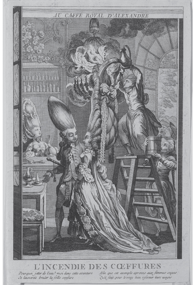 画面描绘了一对夫妇,在D’Alexandre皇家咖啡馆享受茶点。这家咖啡馆是典型的巴黎风格,有着巨大的玻璃橱窗。行人透过橱窗,就能看到咖啡馆内华贵时尚的男男女女。画面上,男主角正为同行的女伴拉开座椅,一派绅士风度,然而此时,女伴头顶高高的假发,无意中碰到了天花板上的枝形烛台,被蜡烛一燎,冒出滚滚浓烟。服务员们吓坏了,他们搭起梯子,争先恐后爬上去灭火。配图的文字刚好相反,没有一丝同情:“浇什么水呢?这种愚蠢的发型烧起来才好呢。”当然,真正的假发不可能有图上描绘的那么高,但是固定假发的发胶确属易燃物质。这幅《假发之火》为我们提供了想象的空间,将发饰的危险描绘无遗。然而,此画问世的几十年后,女性的衣饰仍未吸取前车之鉴,棉质衣物、宽大的衬裙、塑料梳子……它们变身火引,将无数爱美女性卷入大火之中——死神降临。