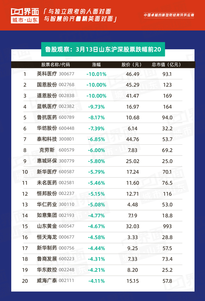 3月13日,山东省内沪深股票有41只个股上涨,163只下跌,6只与上一个交易日收盘价持平。英科医疗涨幅为-10.01%,领跌山东,收于46.49元/股。