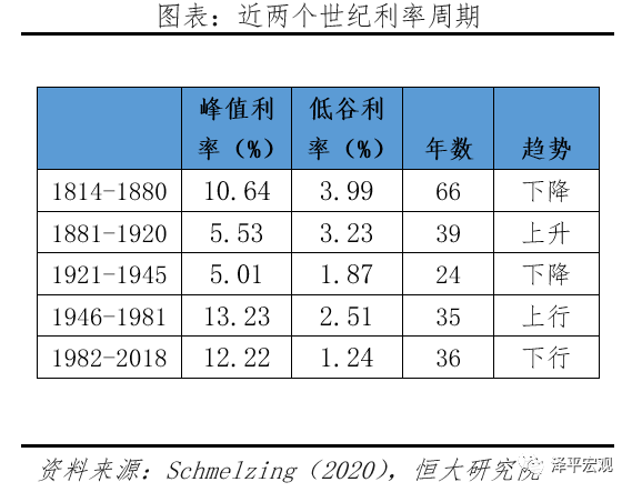 19-20世纪,人类历史进入工业革命和经济增长新阶段,近代时期利率出现五次长周期波动,同时创造出最高和最低的利率记录。1)1814-1880年,伴随工业革命兴起至美国内战结束,西方国家进入工业发展和殖民扩张阶段,利率呈现波动下行,平均值从10%下降到4%,历时66年。2)1880-1920年,美国接替英国成为全球金融中心,利率止步下行,并在20世纪前20年伴随美国经济繁荣上升至5.5%。3)1920-1945年大萧条、经济复苏和二战主导世界格局,利率经历24年下行期,最低降至1.8%。4)1946-1981年,凯恩斯主义盛行,石油危机引发恶性通胀,利率进入35年上升周期,主要国家利率大幅上涨至13%,创两百年以来最高纪录。5)1981年至今,自由化和全球化程度提高,利率进入波动下行周期,08年次贷危机进一步加重利率下行趋势,降幅高达11个百分点,创有记录以来最低利率区间。