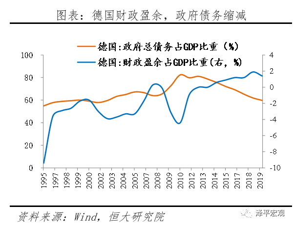 政策面上,紧财政、宽货币。财政政策方面,德国欧债危机后,德国致力于缩减政府债务,近5年连续保持财政盈余,2019年财政盈余占GDP比重1.4%,政府部门杠杆率连续八年下降,2019年为59.8%,远低于欧元区-0.6%赤字率和85.9%杠杆率。货币政策方面,德国央行素有稳定物价传统,长期实施相对谨慎的财政货币政策,在欧洲财政难以统一的情况下,德国被迫维持相对宽松的货币环境,2008年欧央行7次降息, 2014年正式实施负利率政策。德国货币供应总体上保持稳定,M2占GDP的比重逐渐上升,2019年为92%,升幅总体不大。