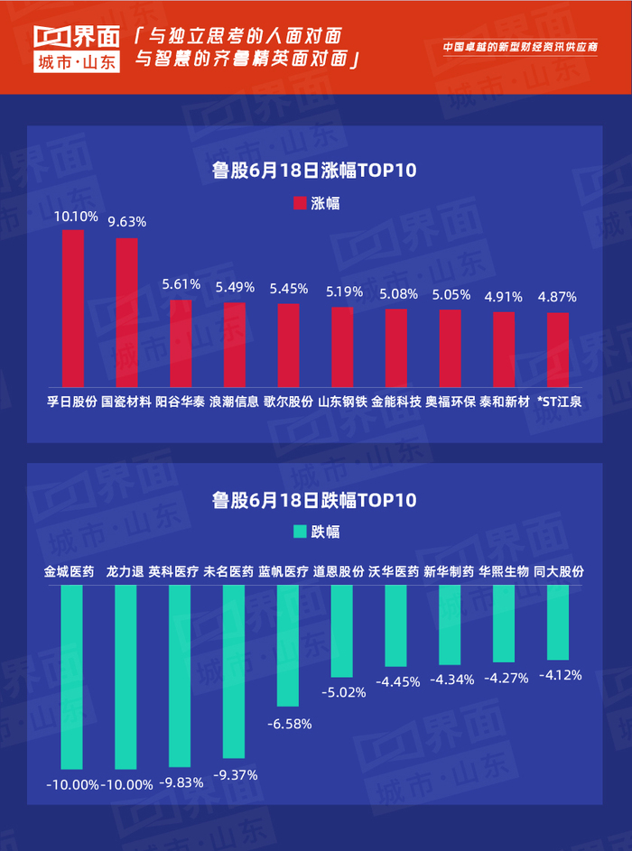 受大盘影响,6月18日,山东省内沪深股票有86只个股上涨,119只下跌,8只与上一个交易日收盘价持平,中泰证券全省跌幅最大,达-10%。