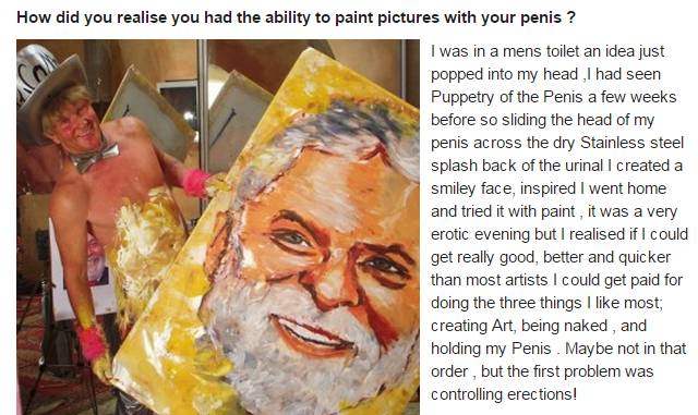 音乐节什么的弱爆了,总有根本不喜欢音乐的人去装逼。性文化节就不会,毕竟性是所有空虚里最棒的一种,去的人一定都是孤独寂寞又满眼欲望。而前两周刚结束的英国性文化节(Sexpo UK)上,就有一个无比空虚寂寞的澳大利亚六旬老头儿——Tim Patch。他自称哔加索(Pricasso),身体虽然比不上那些小鲜肉,但能参加性文化节,自然有绝活。那就是……