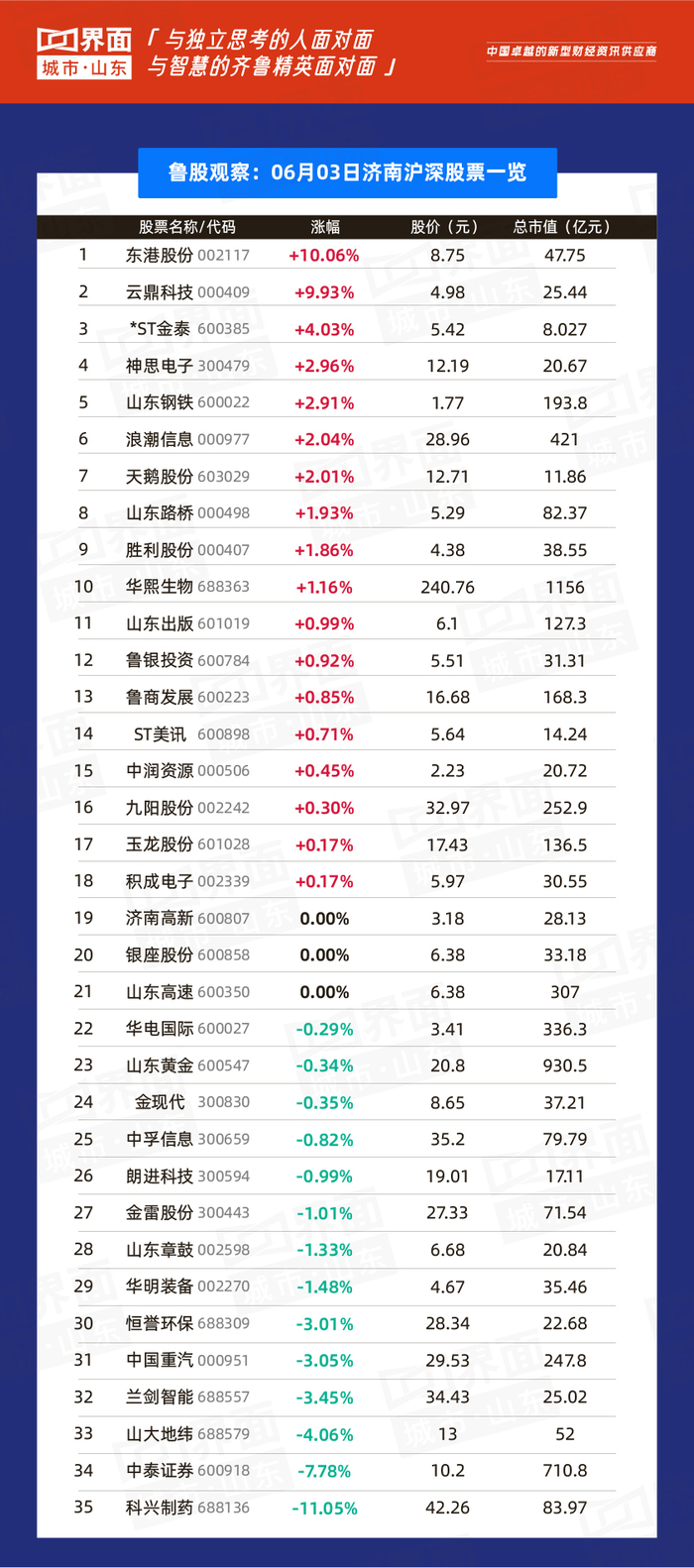 受大盘影响,6月3日,山东省内沪深股票有93只个股上涨,130只下跌,东港股份领涨。
