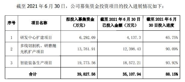不但在上市之后业绩出现变脸,当初IPO时宇晶股份所披露的募投项目也出现了延期的问题。2021年8月2日宇晶股份发布了募投项目延期的公告,其中显示,首发实际募得资金净额为39,827.56万元,计划全部用于“研究中心扩建项目”、“多线切割机、研磨抛光机扩产项目”和“智能装备生产项目”。不过,出于各种原因,这三个募投项目需要延期,综合起来只完成了88.15%的进度,其中“研究中心扩建项目”的投入进度只有65.75%。