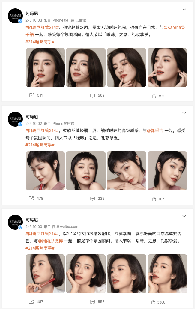 类似的还有前述纪梵希情人节礼盒中换了新包装的高定香榭唇膏和四宫格散粉,以及ARMANI阿玛尼在情人节期间主推的红管#214“暧昧”。实际上该色号在2021年底已经上市,但为了配合情人节的日期和氛围,阿玛尼邀请周雨彤、郭采洁、吴千语等演员明星拍摄广告,再次加大该产品的推广。