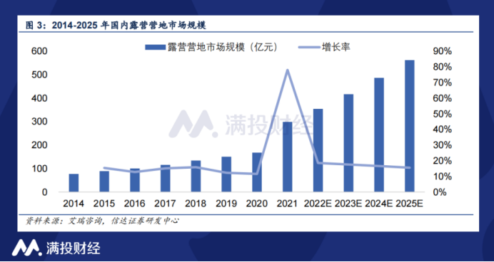 在2020年以前,我国的露营经济发展缓慢,据艾媒咨询数据,2014年至2020年我国的露营营地市场规模的复合增速为13.9%,而2021年至2025年期间预计增速可以达到17.1%。企查查数据显示,近十年我国“露营地”相关企业的注册量也逐年上升,仅2020年就新增8758家相关企业,同比增幅高达227.52%,为近十年来的最大增速。2020年疫情的爆发使露营行业迎来爆发式发展,同时疫情影响时间的延长,让露营在市场上仍维续相当高的热度。