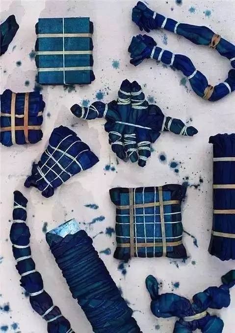 它是通过纱、线、绳等工具,对织物进行扎、缝、缚、缀、夹……等多种形式组合后进行染色。