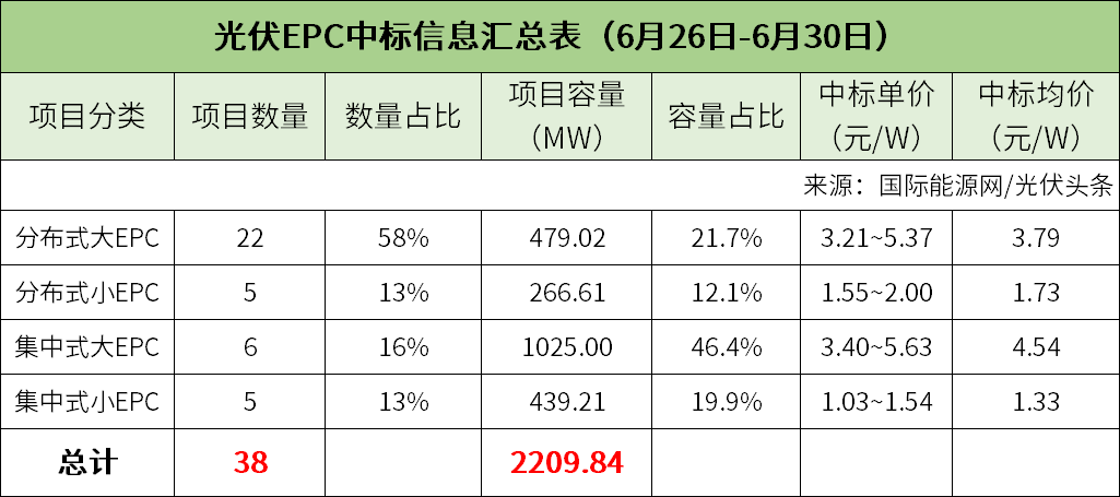 国际能源网/光伏头条(PV-2005)最近对6月份第5周(6月26日-6月30日)光伏EPC招/中标项目进了不完全统计,当周招标规模合计3114.09MW,中标规模合计2209.84MW,招中标规模合计5323.93MW。