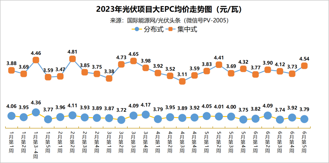 如果说只看单周的招标价格没有代表性的话,那么,从国际能源网/光伏头条统计的结题来看会更加一目了然。整个2023年上半年,集中式EPC价格一直在上涨,分布式EPC价格也只是略降!