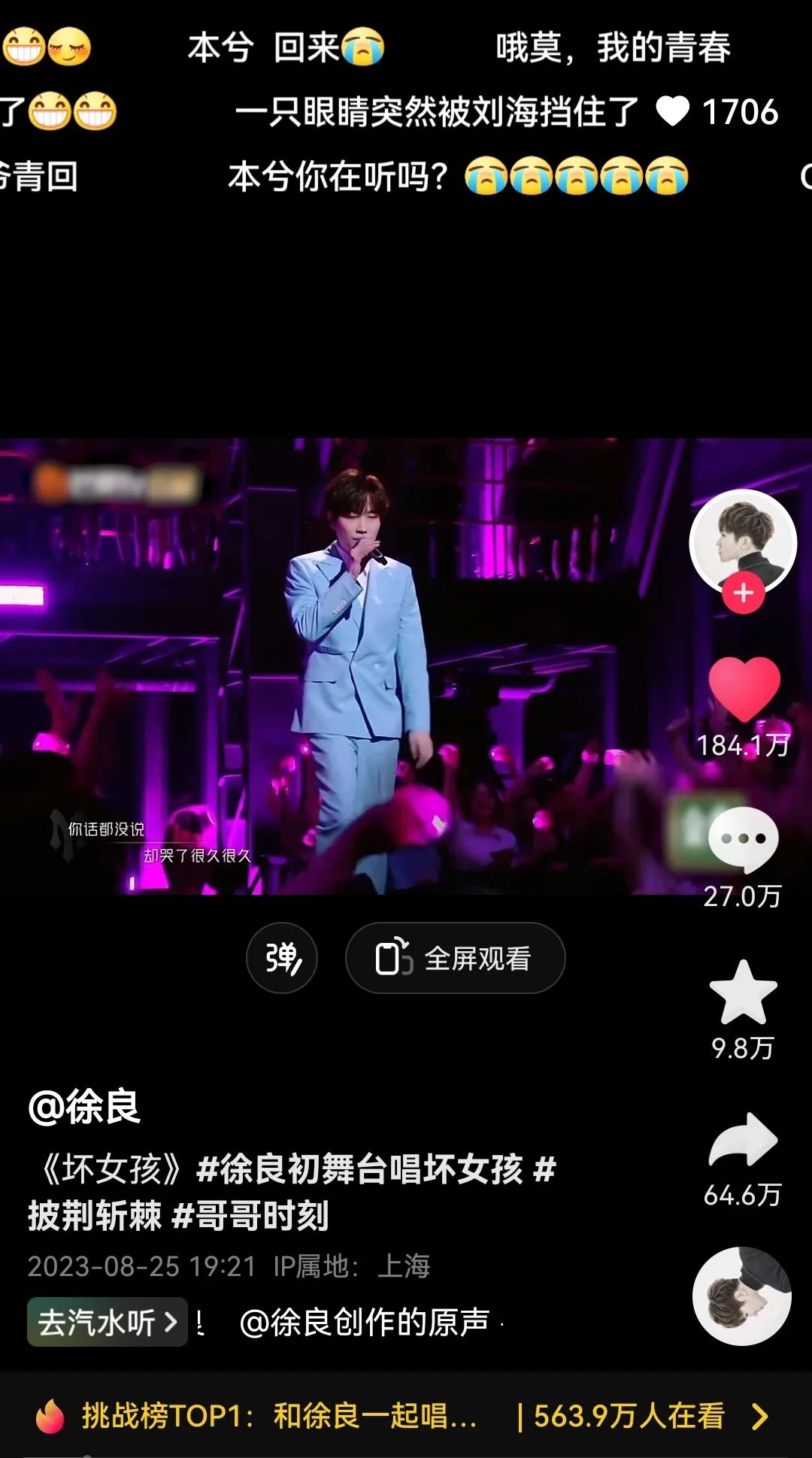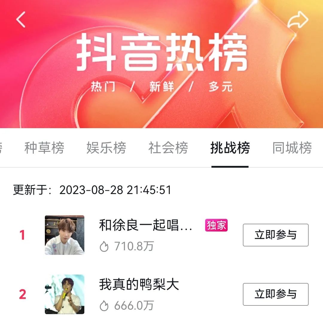 首当其冲依旧是徐良的这首歌,在节目中播出后,为了继续带动节目热度,徐良在抖音发起了合唱挑战,于是乎,这两天的抖音平台中,“和徐良一起唱坏女孩”连续问鼎挑战榜TOP1,吸引众多大V合唱与模仿。