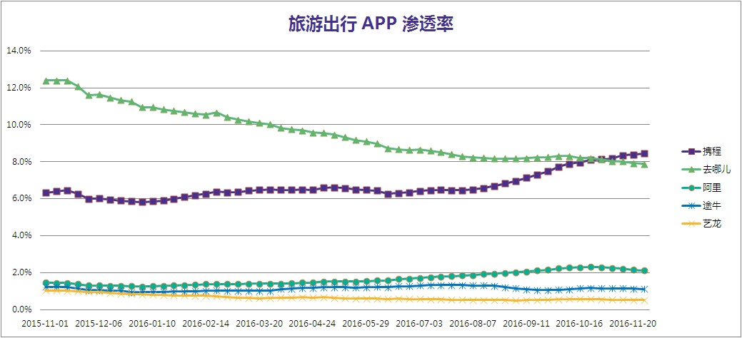 极光数据研究院提供的资料显示,自 2015 年 11 月至 2016 年 11 月,携程 APP 的市场渗透率一直呈现稳步上升趋势,从最初的 6.3% 攀升至 8.5%。与其形成鲜明对比的是,去哪儿 APP 的市场渗透率则一路走低,从最初的 12.4% 下跌至 7.9%。除了合并所带来的负面影响外,发生于今年一月初的航空公司集体抵制事件似乎也对去哪儿造成了较大的困扰。同样被划归携程系的艺龙,其渗透率却从最初的 1% 下跌至 0.5%,表现并不理想。