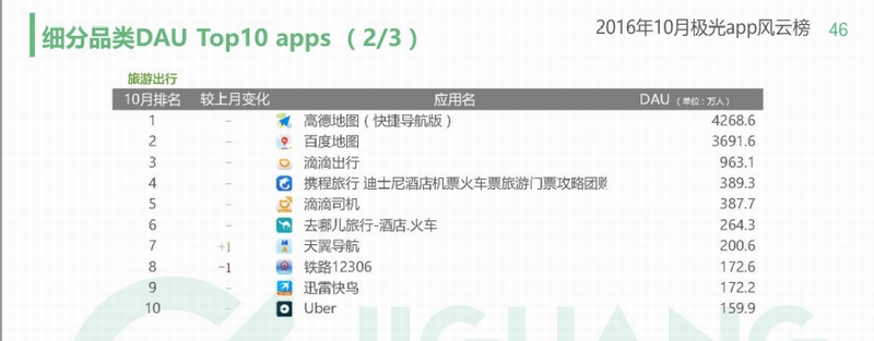 从同一份榜单可见,携程和去哪儿的日活跃用户表现也远远抛离了其他对手,在旅游出行细分类别中分别位列第 4 和第 6 位。排名前三甲的同类应用分别为高德地图、百度地图和滴滴出行,介乎携程和去哪儿之间的则为滴滴司机应用,其他竞争对手均未进入前 10。