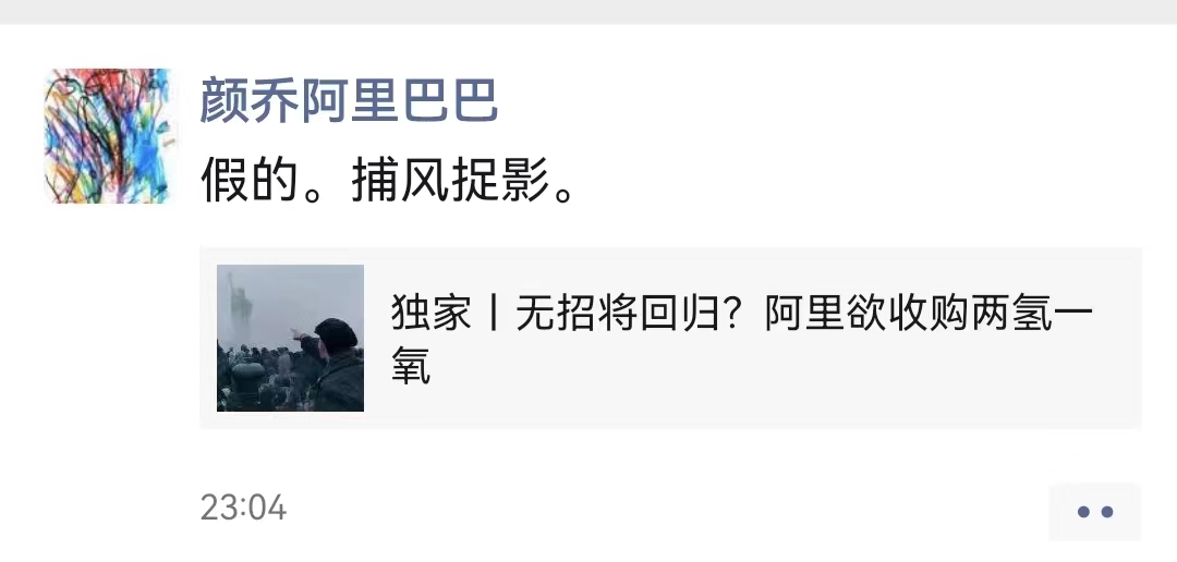 8月28日晚间,雷锋网爆料阿里巴巴正在与两氢一氧进行收购谈判,意在收编陈航(花名无招)及其核心团队一事,此后,阿里巴巴集团副总裁颜乔在朋友圈回应称:“假的。捕风捉影。”