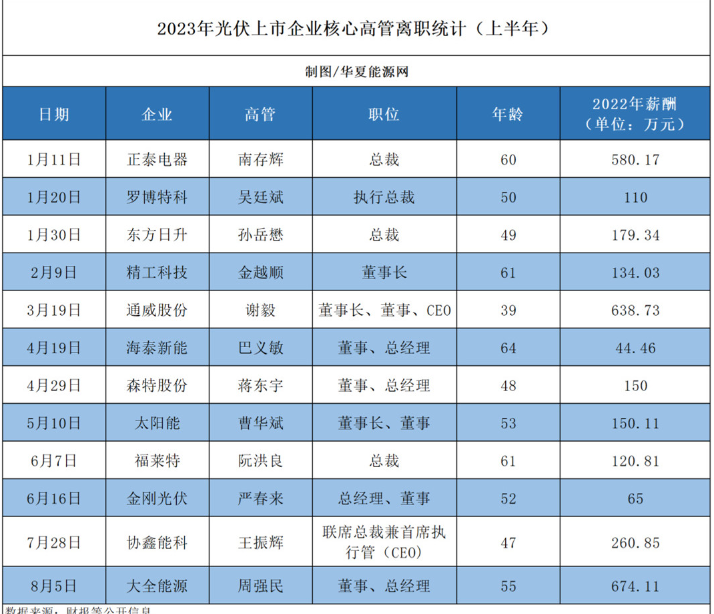 更早的还有通威股份(SH:600438)前董事长谢毅、爱康科技(SZ:002610)前常务副总裁朱治国、东方日升(SZ:300118)前总裁孙岳懋,天合光能(SH:688599)前董事、副总经理曹博,协鑫能科(SZ:002015)前首席执行官、联席总裁王振辉等,都相继离职。